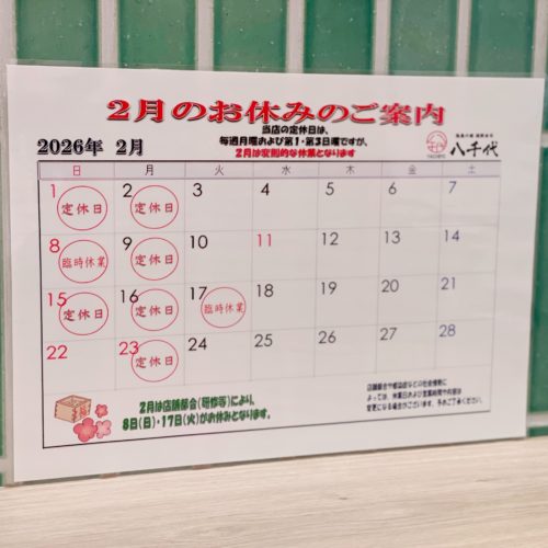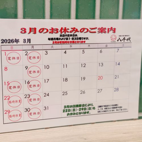 お知らせ ホーム > お知らせ 八千代からのお知らせ 2026.02.27 2026年3月の店休日のお知らせ いつも陸奥の國 廻鮮寿司 八千代をご愛顧いただき誠にありがとうございます。 3月の店休日のご案内です。1日(日曜)、2日(月曜)、9日(月曜)、15日(日曜)、16日(月曜)、22日(日曜)、23日(月曜)、29日(日曜)、30日(... 詳細を見る 2026.01.27 2026年2月の店休日のお知らせ いつも陸奥の國 廻鮮寿司 八千代をご愛顧いただき誠にありがとうございます。 2月の店休日のご案内です。 1日(日曜)、2日(月曜)、8日(日曜)、9日(月曜)、15日(日曜)、16日(月曜)、17日(火曜)、23日(月曜)とな... 詳細を見る 2026.01.22 2026年恵方巻に関するお知らせ いつも陸奥の國 廻鮮寿司 八千代をご愛顧いただき誠にありがとうございます。 毎年恒例の節分恵方巻ですが、今年度は店舗都合により販売予定がございません。 いつもご注文いただいておりますお客様には大変なご不便をおかけいたしますが、ご... 詳細を見る 2024.12.28 12月29日は午後も店内営業いたします! 営業内容変更のお知らせです🍣 当店の12月の予定のなかで、29日はお昼の部が通常営業・午後の部がテイクアウトとなっていましたが・・・ 29日は午後の部も店内営業をいたします✨年内最後の店内営業日となりますので、ぜひ皆様のご来店を... 詳細を見る 1 2 3 »