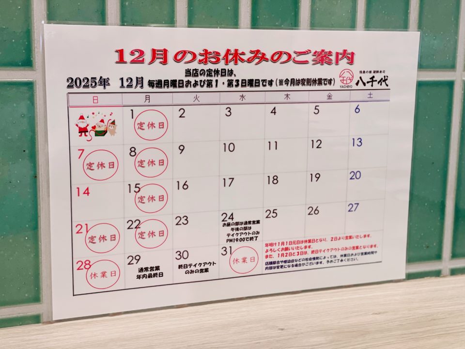2025年12月の店休日のお知らせ